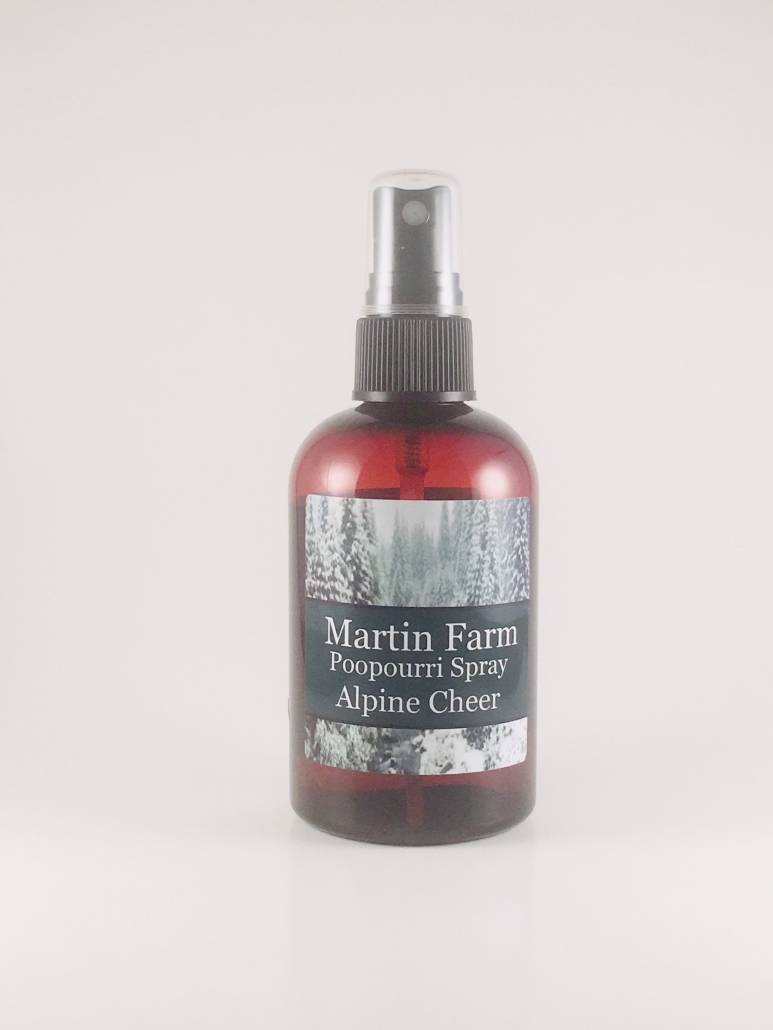 Martin Farm Alpine Cheer Poopourri is an all natural way to cover unwanted smells. Alphine Cheer is Holiday notes of fir needle, cinnamon stick, cranberries, crisp apple and cedarwood.