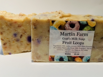 Martin Farm Fruit Loops Goat’s Milk Soap is a sweet and delectable delight of juicy orange, ripe berries, tangerine and sugared vanilla. Smell just like a bowl of your favorite Cereal.