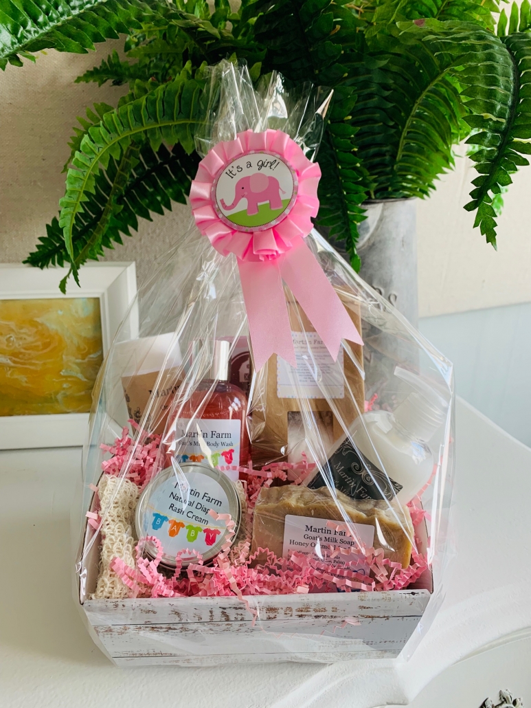 Contains: Baby Powder Body Wash, Baby Goat’s Milk Soap, Unscented Goat’s Milk Lotion, Diaper Powder, 16 oz Baby Detergent, Rash Cream, and a Luffa Soap Pouch.