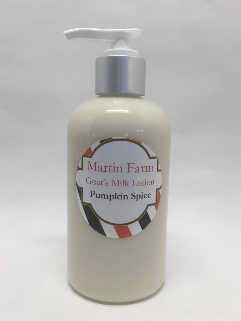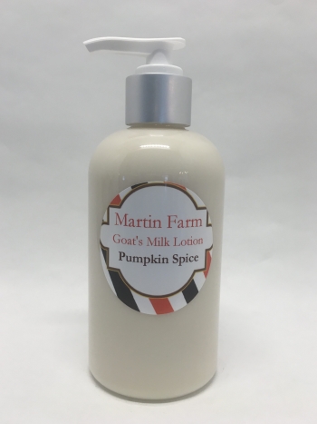 Martin Farm Pumpkin Spice Goat’s Milk Lotion is Clove, nutmeg, cinnamon, vanilla and pumpkin puree blend together for a delicious treat.