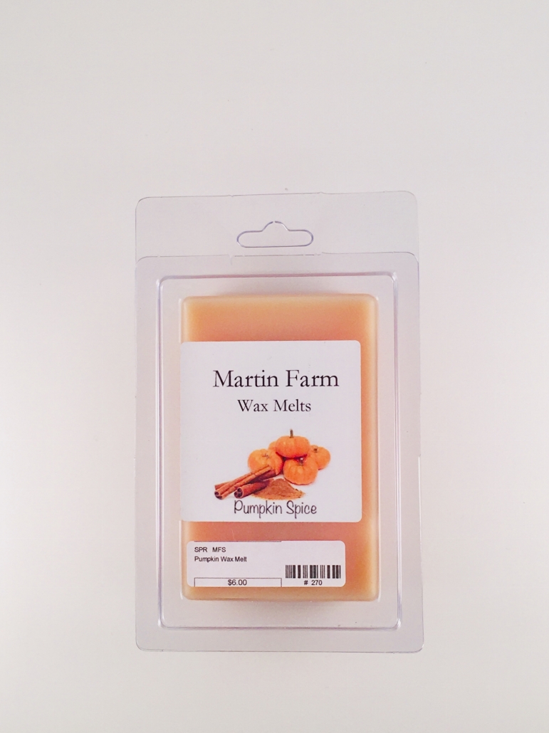 Martin Farm Pumpkin Spice Wax melts is a fragrance of Clove, nutmeg, cinnamon, vanilla and pumpkin puree blend together for a delicious treat.