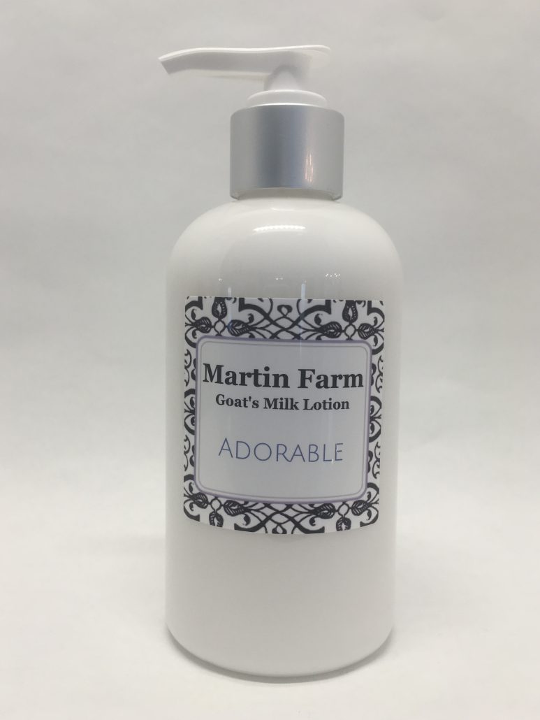 Martin Farm Adorable Goat’s Milk Lotion is a blend of jasmine, lily and violet with juicy apple and lime.