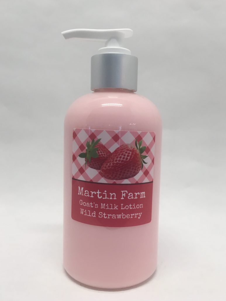 Martin Farm Strawberry Goat’s Milk Lotion has the sweet scent of red strawberry and raw cane sugar with notes of green apple and green vine.