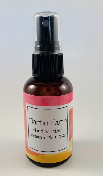 Martin Farm Jamaican Me Crazy Moisturizing Hand Sanitizer  is an explosion of tropical fruits and rum blended into an irresistible summer drink. This fruity scent begins with ripe pineapple, orange, and apple for a super juicy first impression. Middle notes of succulent melon and creamy coconut add to the beachy aroma, while light jasmine notes give it a subtle floral quality. The rum base note turns this fruity fusion into a cocktail with a touch of vanilla that rounds out this delicious fragrance. Orange essential oil ensures the citrus element permeates throughout the scent.