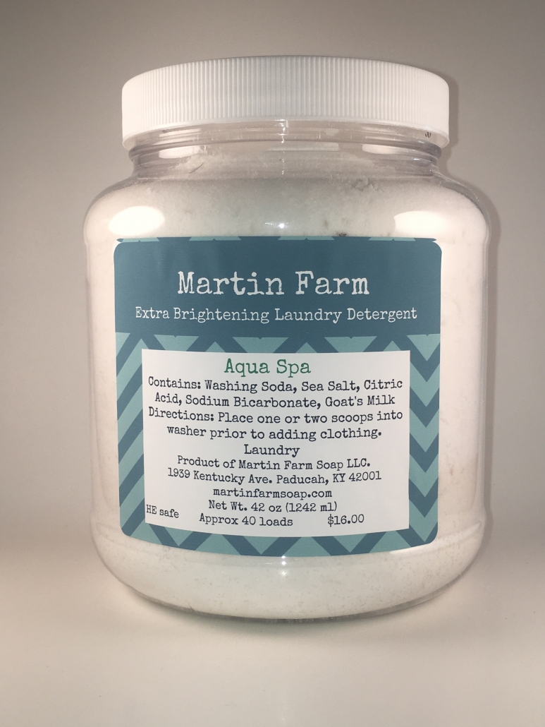 Martin Farm Soap introduces Aqua Spa Laundry Detergent.  This fabulous recipe  contains: Washing Soda, Sea Salt, Citric Acid, Sodium Bicarbonate, Goat’s Milk and Fragrance.  Directions for use: Use 2 Tablespoons  per load of laundry. This formula is special blended to give your laundry that Extra Boost of cleaning Power!