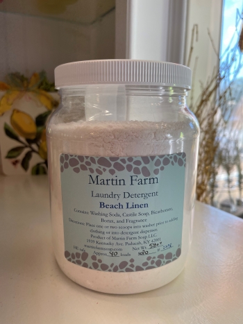 Martin Farm Soap introduces Beach Laundry Detergent! Ingredients: Beach Fragrance Oil, Washing Soda, Borax, Sodium Bicarbonate, and Castile Soap. Directions for use: Use 2 Tablespoons per load of laundry.
