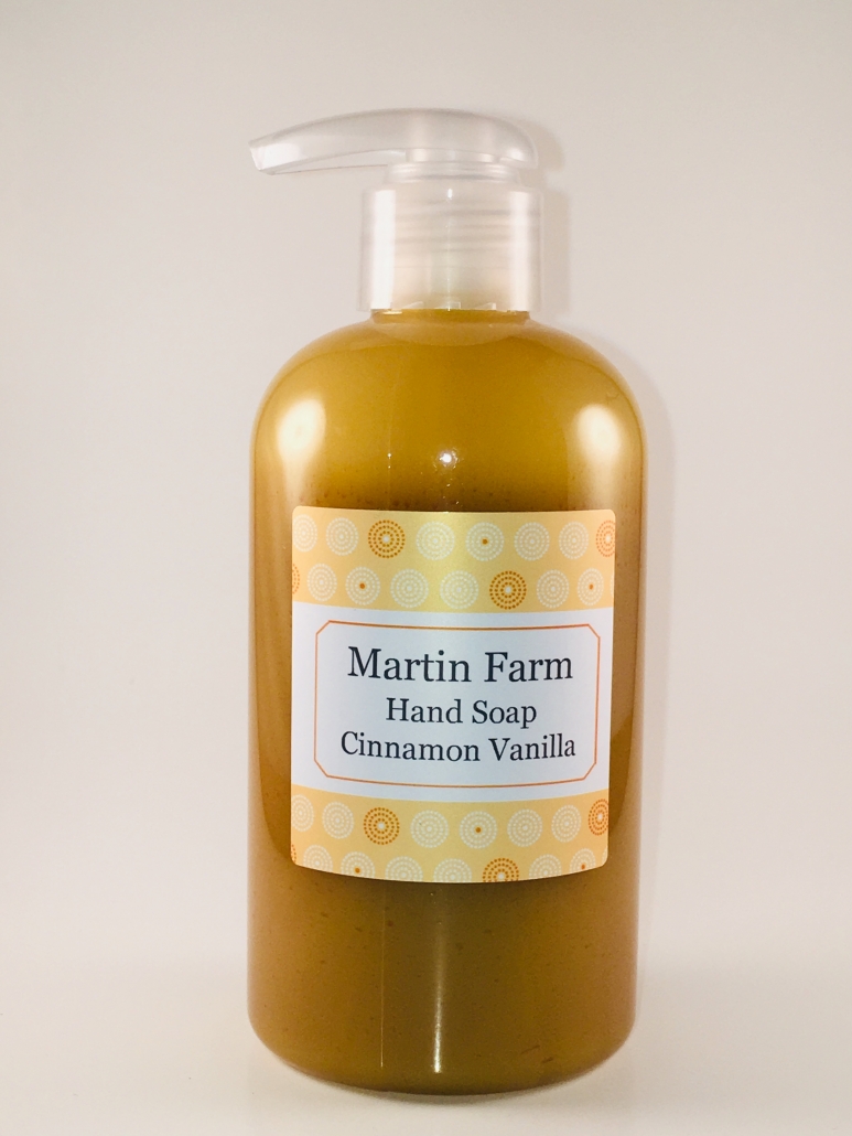 Martin Farm Cinnamon Vanilla Hand Soap combines the full bodied scent of spicy cinnamon with the sweet and creamy accords of vanilla. This mouthwatering scent evokes the excitement of the fall and holiday seasons. This fragrance oil is infused with natural essential oils, including guaiacwood and guardian balsam.