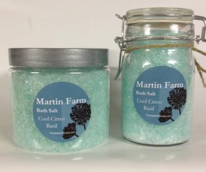 Martin Farm Cool Citrus Basil Bath Salt is a blend of fresh, just picked garden greens and basil accented with sparkling lime.