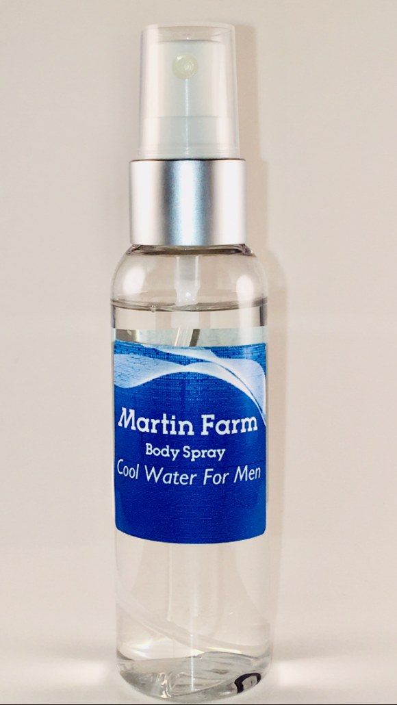 Martin Farm Cool Water for Men Body Spray is a sophisticated blend of marine and green notes with cooling mint contrasted with rich cedarwood and musk.