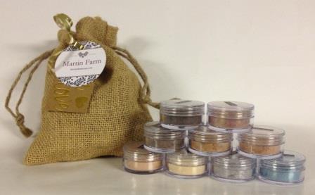 Martin Farm Eye Shadow Gift Set includes 9 mineral Eye Shadows for the price of $35. Total savings $12. Eye shadows included in gift set: 24k Gold, Sterling Silver, Gingerbread Brown, Chocolate Brown, Silk Stockings, Sunset Rose, Bronze Sparkle, Blue Green, and Honey Beige.