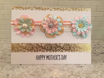 Flower with Mom Card, 3 flowers, gold ribbon, lace ribbon