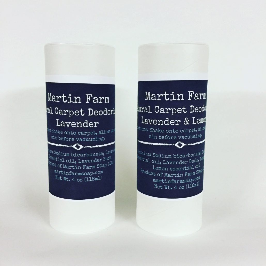 Martin Farm Lavender and Lemon Carpet Deodorant is a natural way to freshen up your carpet. It is made with ground Lavender, Lavender Essential Oil,  Sodium Bicarbonate, Dried Lemon Peel, and Lemon Essential Oil.