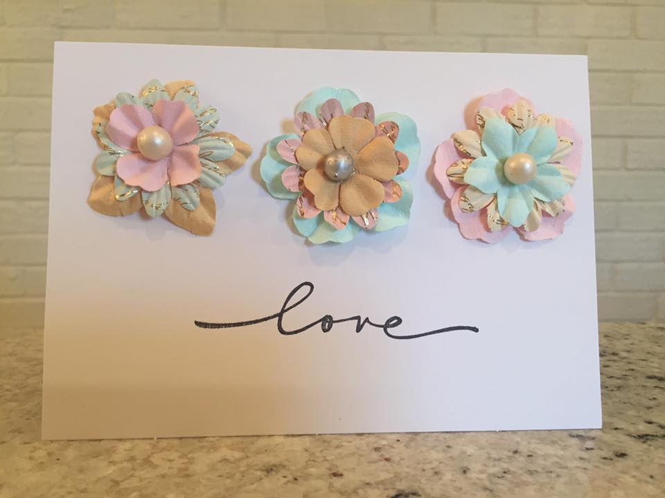 Card with 3 flowers and Love on the front. Each Card is hand made and may vary in color or flowers.