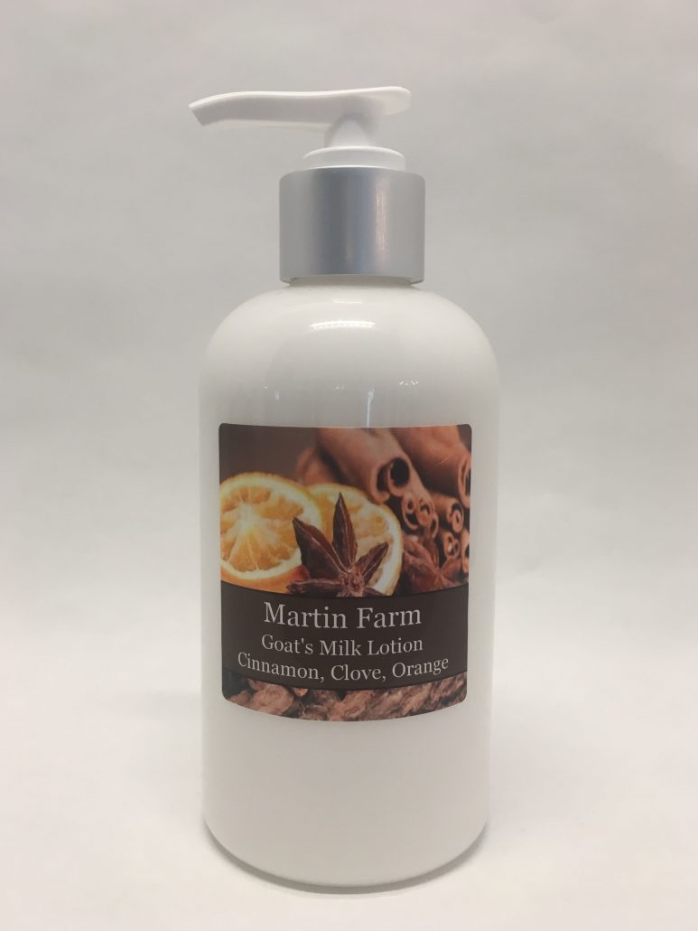 Martin Farm Orange Clove and Cinnamon Goat’s Milk Lotion  is An enticing blend of Valencia orange, cinnamon leaf and Madagascar clove. This Goat’s Milk Lotion will leave your hands silky smooth with the sent of Cinnamon, orange, and clove. This is a great Holiday Lotion.