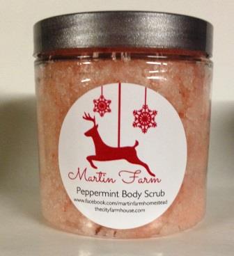 Martin Farm Peppermint Body Scrub is a Cool minty aroma of fresh peppermint leaves. Leaves your body feeling fresh and stimulated. Martin Farm Body Scrubs come in four sizes 16oz ($14), 12oz ($10), 8oz ($5) 2oz Sample Size ($2)