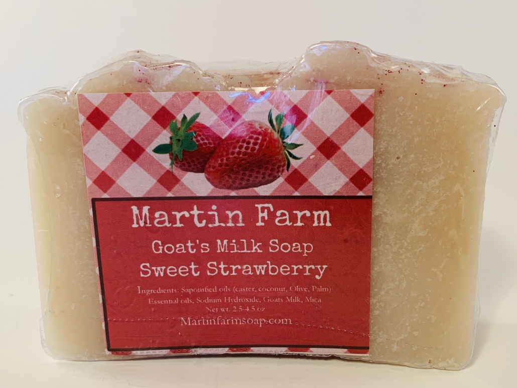 Martin Farm Strawberry Goat’s Milk Soap has the sweet scent of red strawberry and raw cane sugar with notes of green apple and green vine.
