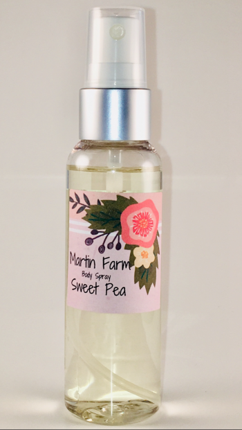 Martin Farm Sweet Pea Body Spray is Sweet pea petals and watery pear entwine with sheer freesia, fresh berry, and soft, delicate musk.