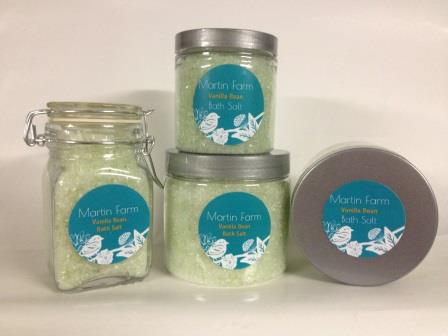 Martin Farm Vanilla Bean Bath Salt come in four sizes: 16oz ($12) 12oz ($9) 8oz ($5) or a holiday glass jar ($10). Martin Farm Vanilla Bean is a warm blend of fresh vanilla bean, rich caramel and soothing cream.